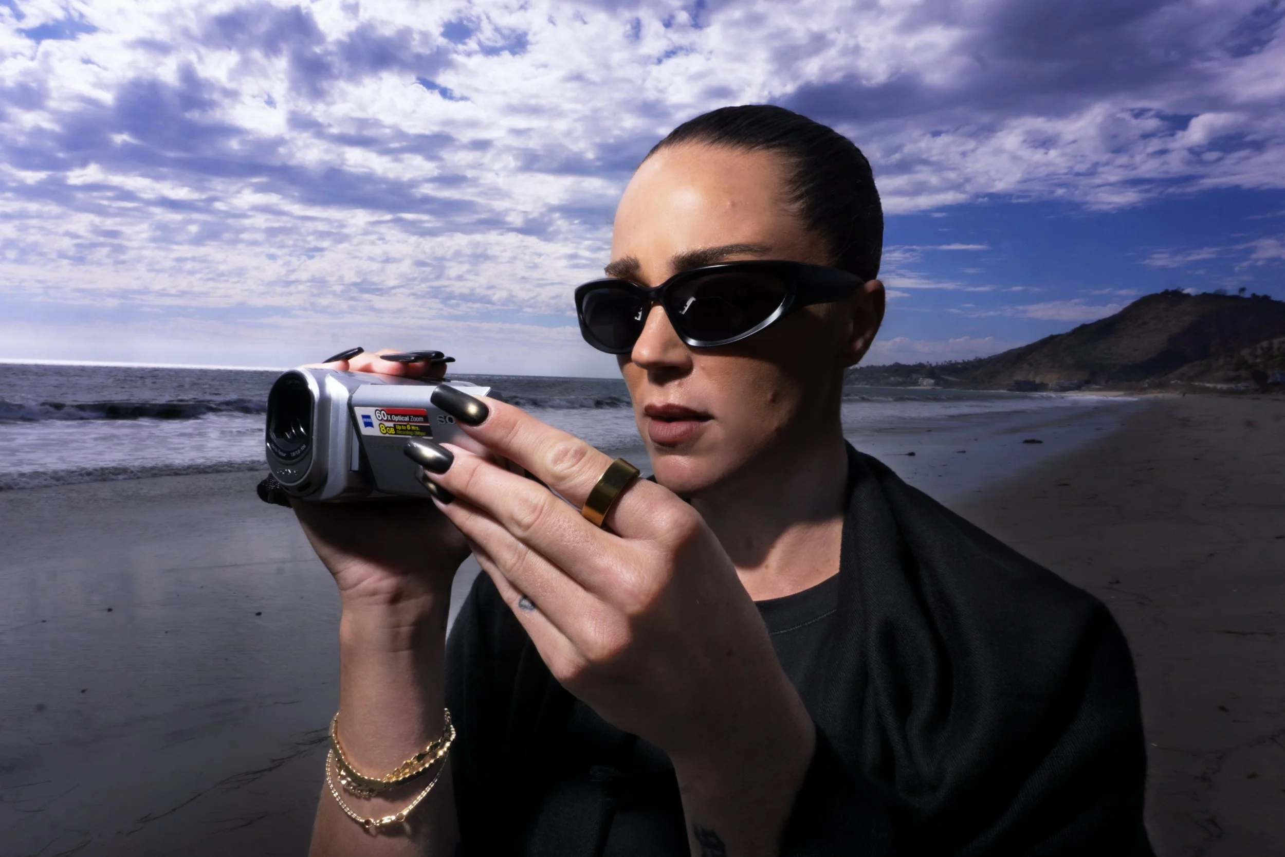 A woman with long blonde hair and a black top stands next to a street sign at the corner of Hollywood Blvd. and McCadden Place, looking to her right with a curious expression.